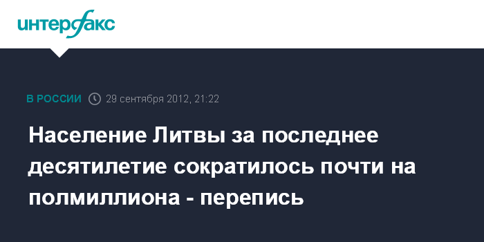 Вильнюс. 29 сентября. ИНТЕРФАКС/BNS - По данным прошлогодней всеобщей переписи населения, в Литве проживало 3 млн 43 тыс. постоянных жителей, за десятилетие население сократилось почти на 441 тысячу, сообщает Департамент статистики республики.