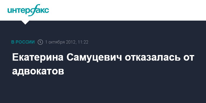 Москва. 1 октября. INTERFAX.RU - Одна из участниц панк-группы "Pussy Riot" Екатерина Самуцевич в ходе рассмотрения жалобы на приговор отказалась от услуг адвокатов, которые защищали ее на протяжении всего процесса.