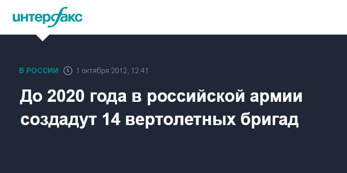 Москва. 1 октября. INTERFAX.RU - В Сухопутных войсках России до 2020 года сформируют несколько десятков новых соединений, в том числе 14 бригад армейской авиации, сообщил "Интерфаксу-АВН" в понедельник официальный представитель управления пресс-службы и информации Минобороны РФ по Сухопутным войскам Николай Донюшкин.