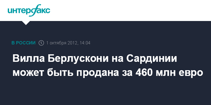 Москва. 1 октября. INTERFAX.RU - Вилла Certosa итальянского экс-премьера Сильвио Берлускони может быть продана за 460 млн евро, сообщает газета La Republicca.