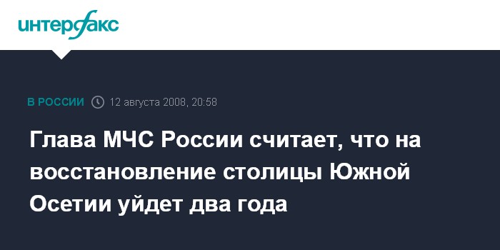 Москва. 12 августа. INTERFAX.RU - На восстановление Цхинвали, разрушенного в результате агрессии со стороны Грузии, потребуется по меньшей мере два года, считает глава МЧС России Сергей Шойгу.