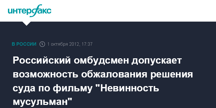 Российский омбудсмен допускает возможность обжалования решения суда по фильму "Невинность мусульман"