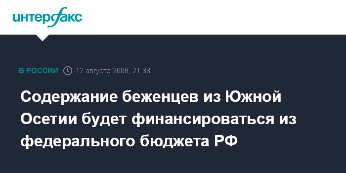 Москва. 12 августа. INTERFAX.RU - Средства на содержание жителей Южной Осетии, вынужденных приехать в Россию после боевых действий в республике, в 2008 году будут выделяться из федерального бюджета России.
