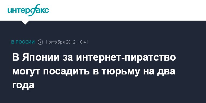 1 октября. INTERFAX.RU - Япония ужесточила наказание за нарушение авторских прав в Интернете, сообщает ВВС. Теперь тем, кто скачивает интернет-файлы с нарушением авторских прав, грозит до двух лет лишения свободы или штраф до 2 млн иен ($25,7 тыс.).