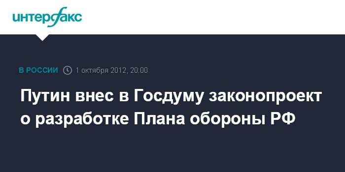 Москва. 1 октября. INTERFAX.RU - Владимир Путин внёс на рассмотрение в Госдуму проект федерального закона о внесении изменений в закон "Об обороне" и отдельные законодательные акты, сообщается на сайте Кремля.