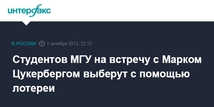 Москва. 1 октября. INTERFAX.RU - Участники встречи основателя сети Facebook Марка Цукерберга со студентами МГУ, которая запланирована на вторник, определятся в ходе лотерии, заявил "Интерфаксу" преподаватель журфака МГУ Григорий Прутцков со ссылкой на деканат факультета.
