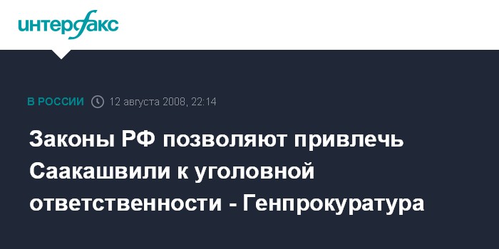"Статья 12 Уголовного кодекса России предусматривает возможность привлечения к уголовной ответственности лиц, совершивших преступление вне пределов РФ", - сообщила "Интерфаксу" во вторник официальный представитель Генпрокуратуры РФ Марина Гриднева. Таким образом она прокомментировала перспективы осуждения президента Грузии Михаила Саакашвили в случае доказательства его виновности в гибели тысяч мирных граждан в Южной Осетии и десятков российских миротворцев.