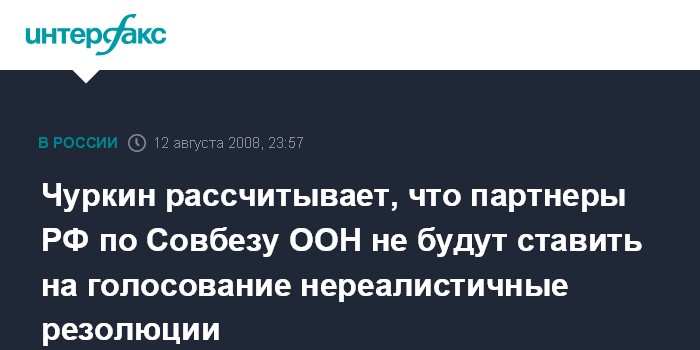 Москва. 12 августа. INTERFAX.RU - Постпред РФ при ООН Виталий Чуркин выражает надежду на конструктивный настрой западных партнеров России по СБ ООН в диалоге по ситуации вокруг Южной Осетии, заявил постпред РФ при ООН Виталий Чуркин.