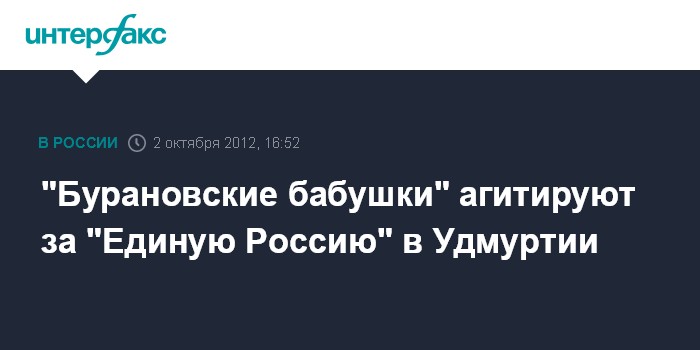 Ижевск. 2 октября. INTERFAX.RU - Фольклорный коллектив "Бурановские бабушки", ставший известным после того, как занял второе место на конкурсе "Евровидение-2012", не остался в стороне от предвыборной кампании в Госсовет Удмуртии.