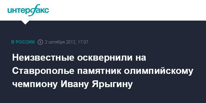 Ставрополь. 2 октября. INTERFAX.RU - В Ставропольском крае проводится проверка по факту осквернения памятника советскому борцу вольного стиля, двукратному победителю Олимпийских игр Ивану Ярыгину.