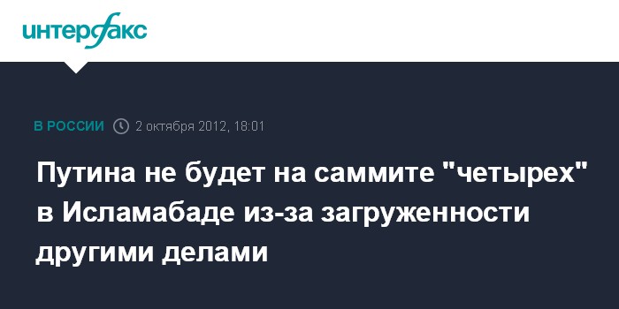 Москва. 2 октября. INTERFAX.RU - Президент РФ Владимир Путин не поехал в Исламабад на саммит лидеров России, Пакистана, Афганистана и Таджикистана в связи с "загруженностью другими делами", заявил помощник президента РФ Юрий Ушаков.
