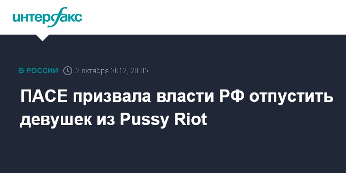 Страсбург. 2 октября. INTERFAX.RU - ПАСЕ призвала власти Российской Федерации немедленно освободить участниц группы Pussy Riot.