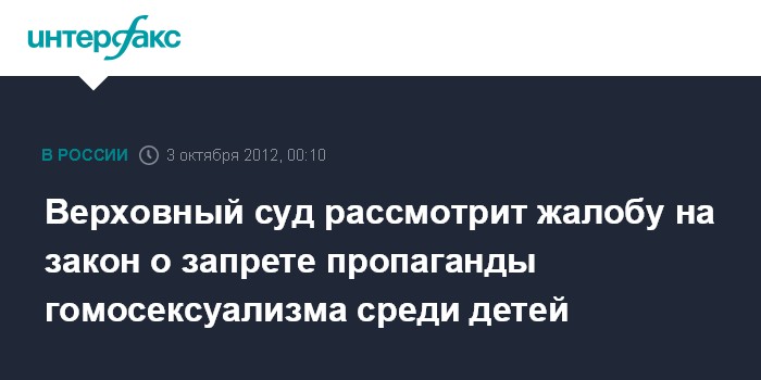 Москва. 3 октября. INTERFAX.RU - Верховный суд РФ рассмотрит жалобу защитников прав сексменьшинств на принятие в Санкт-Петербурге закона о запрете пропаганды гомосексуализма среди несовершеннолетних.