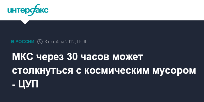 «Информацию о вошедшем в потенциально опасную для МКС зону - так называемый «красный коридор» - космическом мусоре в ЦУП передали американские баллистики. По их данным, возможное столкновение МКС и космического мусора может произойти примерно через 30 часов. Ситуация полностью под контролем. Решение о маневре уклонения будет приниматься после 9:00 мск среды», - заявил собеседник агентства.