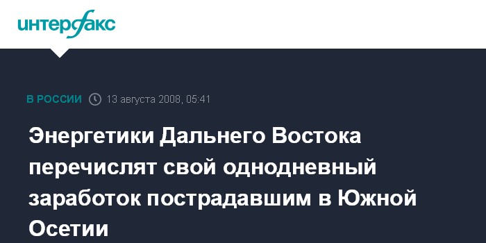 Владивосток. 13 августа. ИНТЕРФАКС - ДАЛЬНИЙ ВОСТОК - Более 45 тыс. сотрудников компаний, входящих в энергетический холдинг ОАО "РАО Энергетические системы Востока", перечислят свой однодневный заработок на расчетный счет, открытый правительством Северной Осетии для оказания помощи населению Южной Осетии.