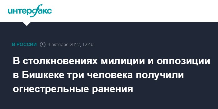 Бишкек. 3 октября. INTERFAX.RU - Три человека получили ранения из огнестрельного оружия во время столкновений между представителями оппозиции и милиции в центре Бишкека.
