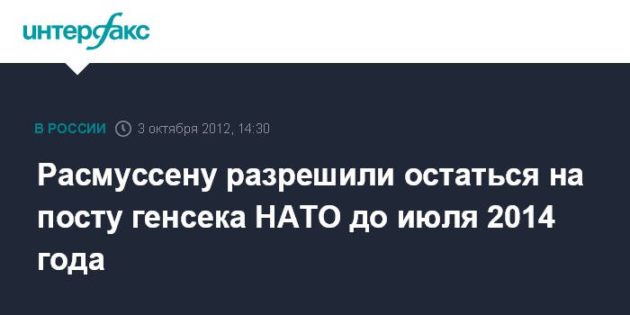 Брюссель. 3 октября. INTERFAX.RU - В НАТО объявили в среду о решении продлить на год мандат генсека альянса Андерса Фога Расмуссена. Таким образом, он сможет занимать эту должность до июля 2014 года.