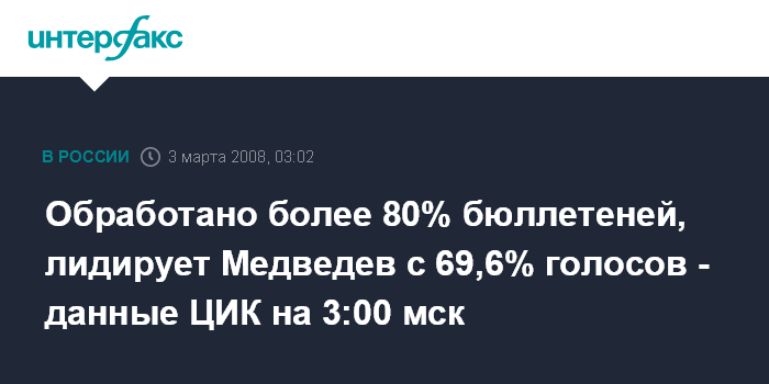 Москва. 3 марта. ИНТЕРФАКС - Первый вице-премьер Дмитрий Медведев одерживает победу на президентских выборах в России. Он набирает 69,61% голосов избирателей.