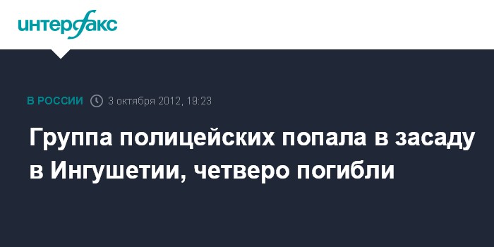 Назрань. 3 октября. INTERFAX.RU - ЮГ - В результате вооруженного столкновения с группой боевиков в селении Датых Сунженского района Ингушетии в среду четверо полицейских погибли, еще двое получили ранения, сообщил агентству "Интерфакс" источник в правоохранительных органах республики.