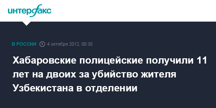Хабаровск. 4 октября. INTERFAX.RU - Суд вынес приговор двум хабаровским полицейским, обвинявшимся в превышении должностных полномочий и убийстве, сообщает прокуратура Хабаровского края в четверг.