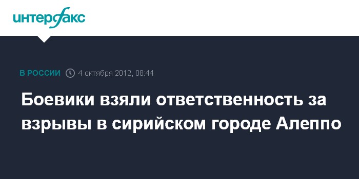 Лондон. 4 октября. INTERFAX.RU - Радикальная вооруженная группировка "Фронт аль-Нусра" взяла на себя ответственность за взрывы в сирийском городе Алеппо, унесшие жизни более 30 человек, сообщает в четверг британская телерадиовещательная корпорация Би-би-си со ссылкой на организацию "SITE Intelligence Group", которая занимается мониторингом экстремистских интернет-ресурсов.