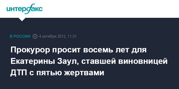 Москва. 4 октября. INTERFAX.RU - Прокуратура в Ногинском городском суде Подмосковья просит приговорить к восьми годам заключения москвичку Екатерину Заул, которая насмерть сбила пятерых человек на Горьковском шоссе.