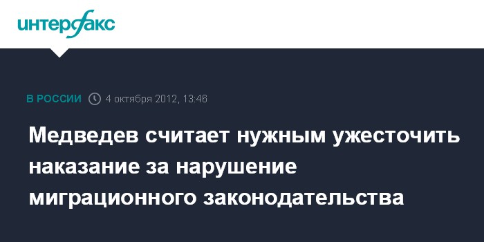 Москва. 4 октября. INTERFAX.RU - Премьер-министр РФ Дмитрий Медведев предложил ужесточить ответственность за нарушения миграционного законодательства.