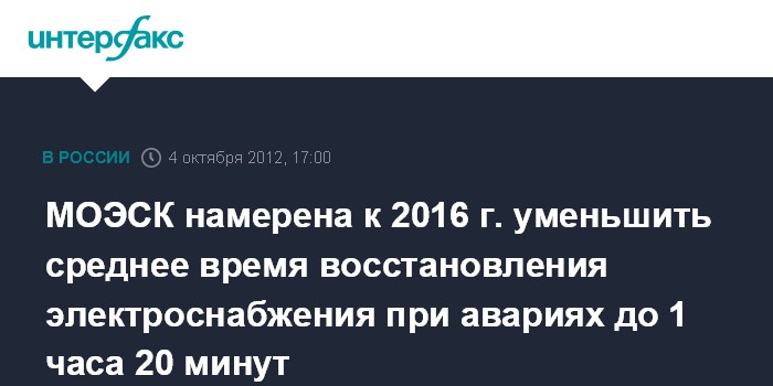 Москва. 4 октября. INTERFAX.RU - ОАО "Московская объединенная электросетевая компания" (МОЭСК) намерено к 2016 году уменьшить среднегодовое время отключения потребителей от электроснабжения до 1 часа.