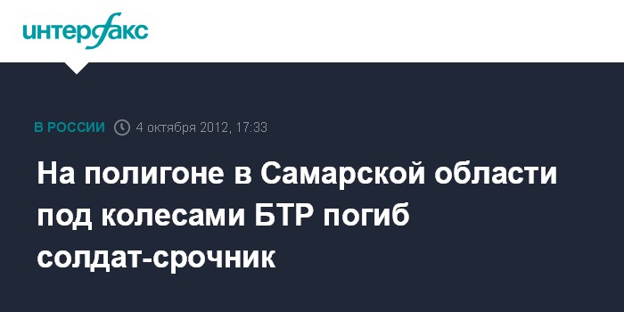 "4 октября около 10:45 мск во время проведения плановых занятий на полигоне "Рощинский" в Самарской области при наезде бронетранспортера получил травмы, несовместимые с жизнью, военнослужащий по призыву из отдельной мотострелковой бригады", - сказано в сообщении, которое поступило в "Интерфакс" в четверг.