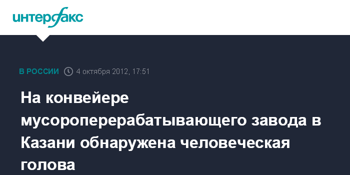 Казань. 4 октября. INTERFAX.RU- Днем в четверг работники мусороперерабатывающего завода Казани обнаружили на конвейерной ленте человеческую голову.