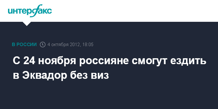 Москва. 4 октября. INTERFAX.RU - Двустороннее соглашение об отмене визового режима между Россией и Эквадором вступит в силу 24 ноября, сообщили в МИД РФ.