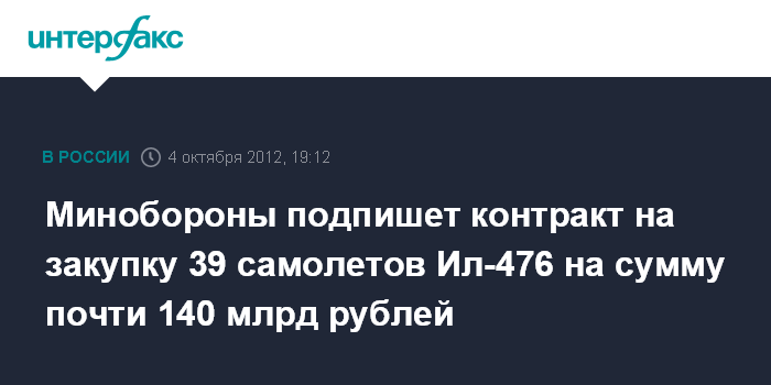Ульяновск. 4 октября. INTERFAX.RU - Минобороны РФ в четверг подпишет контракт на серийную закупку транспортных самолетов Ил-476, заявил президент РФ Владимир Путин.