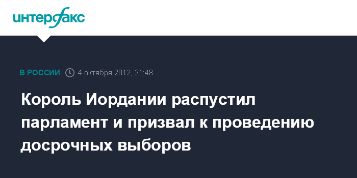 Дубай. 4 октября. INTERFAX.RU - Король Иордании Абдалла II распустил в четверг парламент страны и назначил досрочные выборы, говорится в коммюнике пресс-службы монарха, копия которого получена АФП.