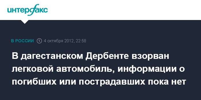 Ростов-на-Дону. 4 октября. INTERFAX.RU - Легковой автомобиль взорвался в четверг вечером на одной из улиц Дербента в Дагестане, сообщили агентству "Интерфакс-Юг" в правоохранительных органах республики.