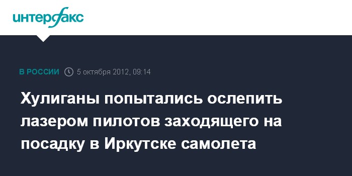 Иркутск. 5 октября. INTERFAX.RU - Транспортная полиция разыскивает хулиганов, попытавшихся в ночь на пятницу ослепить лазерным лучом экипаж самолета, заходящего на посадку в аэропорту Иркутска с 33 пассажирами на борту, сообщили агентству "Интерфакс-Сибирь" в пресс-службе Восточно-Сибирского линейного управления МВД РФ на транспорте.
