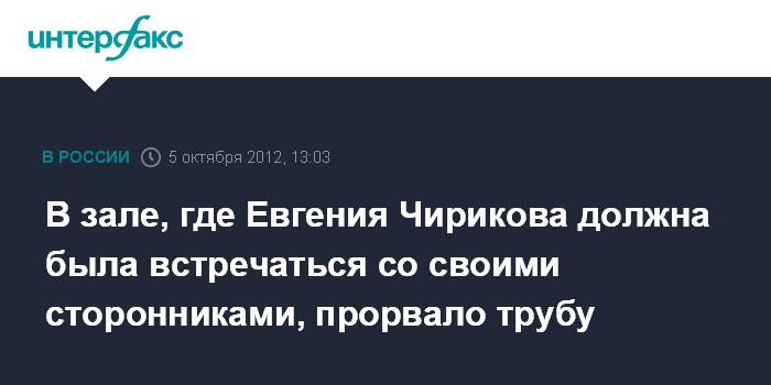 "Нам должны были предоставить зал, поскольку мы оплачиваем эту встречу из избирательного фонда. Но нам никак не могли найти место. В итоге мы нашли коммерческий зал в бизнес-центре, но сейчас нам отказали из-за того, что якобы прорвало трубу", - сказал Чирикова "Интерфаксу" в пятницу.