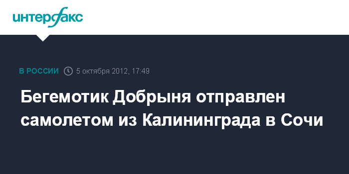 Калининград. 5 октября. INTERFAX.RU - Калининградский зоопарк отправил бегемотика Добрыню на постоянное место жительства в олимпийский Сочи.