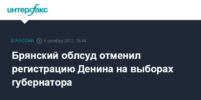 Брянск. 5 октября. INTERFAX.RU - Брянский областной суд принял решение об отмене постановления регионального избиркома о регистрации действующего губернатора Николая Денина в качестве кандидата в губернаторы на выборах 14 октября.