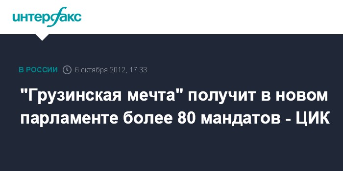 Тбилиси. 6 октября. INTERFAX.RU - Согласно предварительным данным ЦИК Грузии после подсчета 100% голосов избирателей, принявших участие в парламентских выборах 1 октября, победившая коалиция "Грузинская мечта" получит в парламенте нового созыва 83 депутатских мандата.