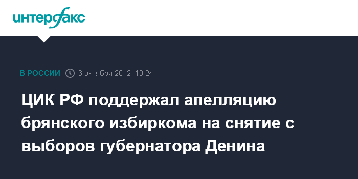 Москва. 6 октября. INTERFAX.RU - ЦИК РФ выразил поддержку Брянской областной избирательной комиссии, которая подала в Верховный суд РФ апелляционную жалобу на решение областного суда о снятии с регистрации для участия в губернаторских выборах действующего главы региона Николая Денина.
