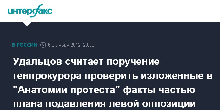 "Заявление генпрокуратуры подтверждает мою версию о том, что все происходящее - спланированная кампания по новым репрессиям против оппозиционеров. Сделано это в преддверие юбилея Владимира Путина, по всей видимости, в качестве подарка", - сказал С.Удальцов в субботу "Интерфаксу", комментируя намерения Генпрокуратуры провести проверку фактов, изложенных в фильме "Анатомия протеста-2" на телеканале НТВ.