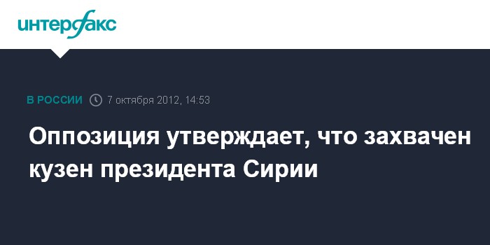 Бейрут. 7 октября. INTERFAX.RU - Сирийские оппозиционеры сообщили о захвате двоюродного брата президента Сирии Хусама Асада. Сообщение появилось на страничке в Твиттере, принадлежащей лидеру сирийских салафитов шейху Аднану аль-Аруру.