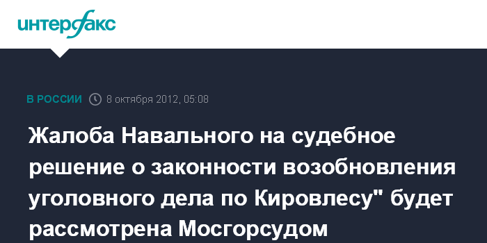 Москва. 8 октября. ИНТЕРФАКС - Мосгорсуд в понедельник рассмотрит жалобу оппозиционера Алексея Навального на решение нижестоящей инстанции, признавшей законным возобновление уголовного дела по "Кировлесу".
