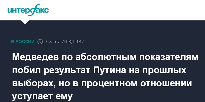 Москва. 3 марта. ИНТЕРФАКС - Дмитрий Медведев по абсолютному числу голосов, отданных за него на президентских выборах, превысил результат, который четыре года назад показал Владимир Путин.