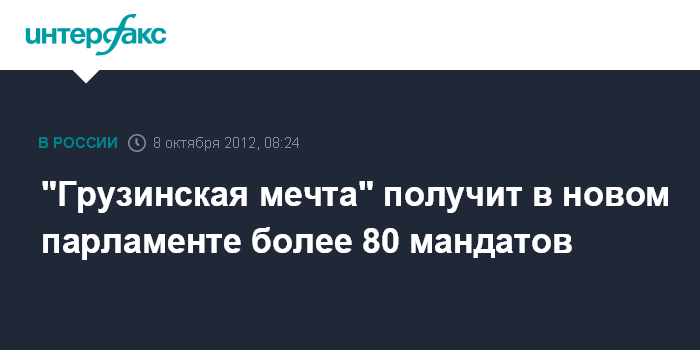 Тбилиси. 8 октября. INTERFAX.RU - Согласно предварительным данным ЦИК Грузии после подсчета 100% голосов избирателей, принявших участие в парламентских выборах 1 октября, победившая коалиция "Грузинская мечта" получит в парламенте нового созыва 83 депутатских мандата.