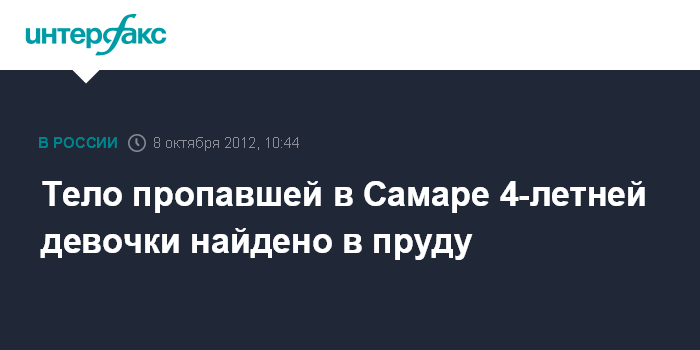 Самара. 8 октября. INTERFAX.RU - Четырехлетняя Настя Казакова, пропавшая накануне днем в Самаре, была найдена мертвой в пруду недалеко от дома, где жила, сообщила агентству "Интерфакс-Поволжье" пресс-секретарь СУ СКР по Самарской области Елена Шкаева.