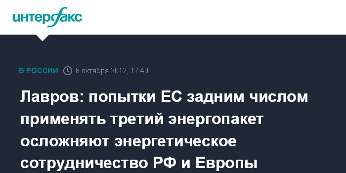 "Ряд шагов Еврокомиссии такое сотрудничество осложняют, имею в виду, главным образом, попытки ретроспективного применения третьего энергопакета в нарушение договорных обязательств ЕС и его членов перед Россией по соглашению о защите инвестиций", - заявил Лавров, выступая перед членами Ассоциации европейского бизнеса.