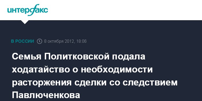 Москва. 8 октября. INTERFAX.RU - Дети Анны Политковской подали в понедельник официальное ходатайство о необходимости расторжения сделки со следствием, которую заключил бывший сотрудник милиции Дмитрий Павлюченков. "Сегодня нами было подано ходатайство в Следственный комитет и в Генеральную прокуратуру о необходимости расторжения сделки со следствием, которую заключил Дмитрий Павлюченков - обвиняемый в убийстве нашей мамы", - говорится в заявлении Веры и Ильи Политковских, которое есть в распоряжении "Интерфакса".