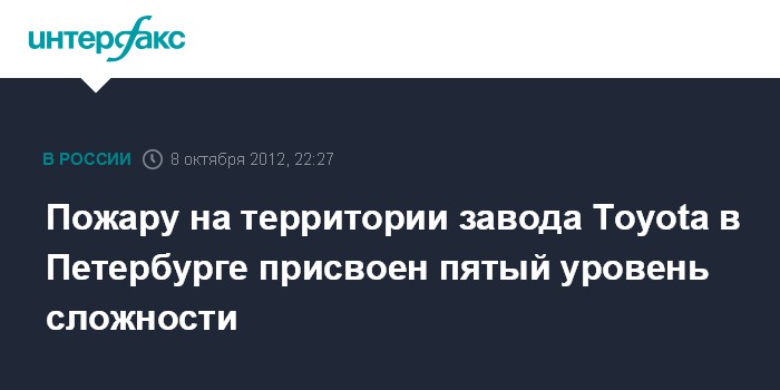 Пожару на территории завода Toyota в Петербурге присвоен пятый уровень сложности