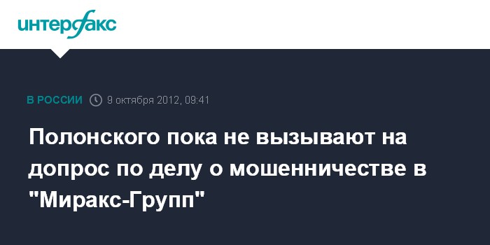 Москва. 9 октября. INTERFAX.RU - Следствие пока не вызывало бизнесмена Сергея Полонского для беседы по делу о мошенничестве с проектом "Миракс-Групп" "Кутузовская миля", сообщили во вторник "Интерфаксу" в пресс-службе ГУ МВД России по Москве.